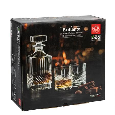 Стилен сервиз от 6 чаши за уиски с елегантна бутилка към тях, произведени от италианската фирма RCR Crystal. Комбинацията от красиво изработеното стъкло и изящна форма носи усещане за истинска наслада от вкуса на малцовата напитка.