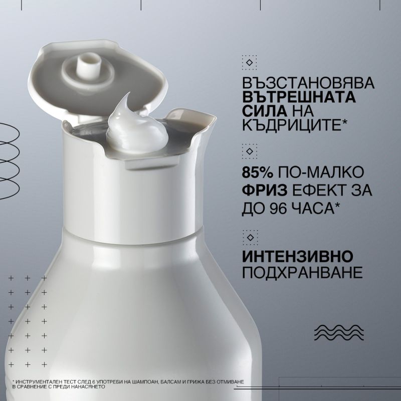 - Осигурява интензивно подхранване до 96 часа**, възстановяване на връзките в косата и вътрешната сила на къдриците*.