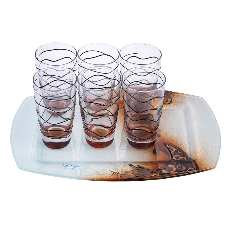 Комплектът, включва 6 чаши за вода и поднос, изработен от муранско стъкло.