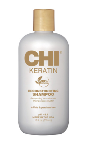 CHI Keratin шампоан нежно почиства и възстановява изтощената коса, възстановява естествените нива на кератин. Съдържа етерични масла от жожоба и арганово масло, които прониквайки дълбоко в косъма го възстановяват и придават блясък. Резултатът е здрава и блестяща коса. Връща гъвкавостта и блясъка на косата. Защитава при топлинна обработка и от увреждане от околната среда.