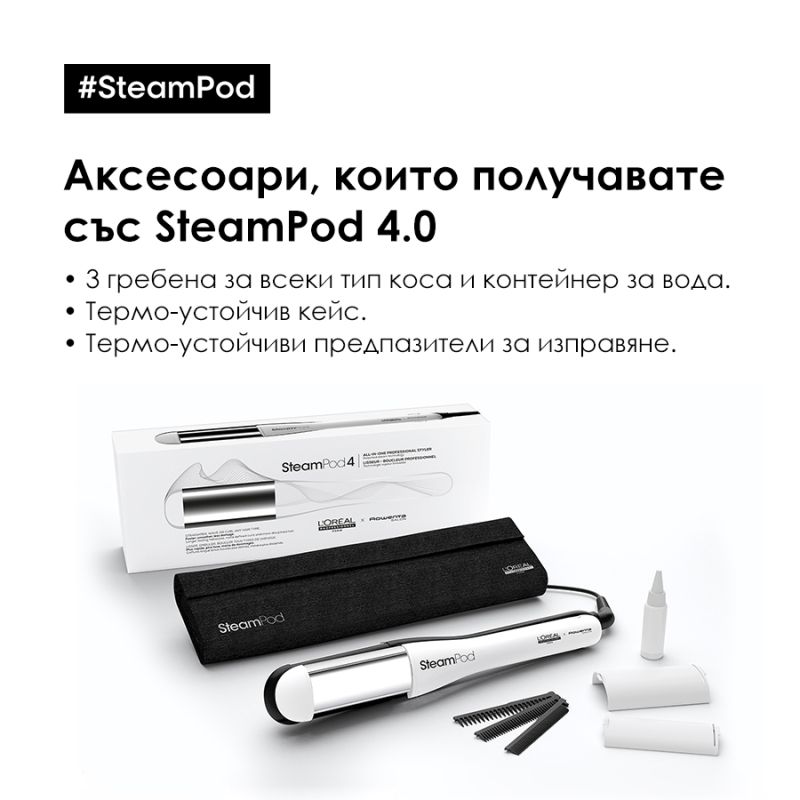 SteamPod 4.0 e мултифункционален уред за коса, разработен съвместно от L'Oréal Professionnel и Rowenta, който използва патентована технология с пара, за да осигури неограничени възможности за стилизиране за всеки тип коса. SteamPod осигурява 3 пъти по-бързо, 2 пъти по-гладко стилизиране на косата, с до 95% по-малко увреждане на косъма. Ергономичната форма на SteamPod 4.0 позволява видимо по-дефинирани и еластични къдрици спрямо SteamPod 3.0, а по-широките плочи позволяват на пресата да достигне до 30% по-близо до корените, постигайки по-добро изправяне спрямо SteamPod 3.0. Създавайте всеки стайлинг на всеки тип коса, като използвате патентована технология с пара.