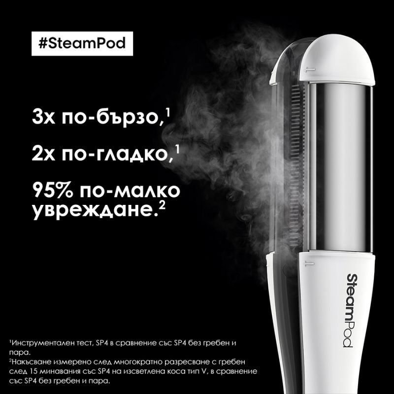 - Със SteamPod 4.0 постигате 3 пъти по-бързо, 2 пъти по-гладко стилизиране на косата, с до 95% по-малко увреждане** на косъма.
