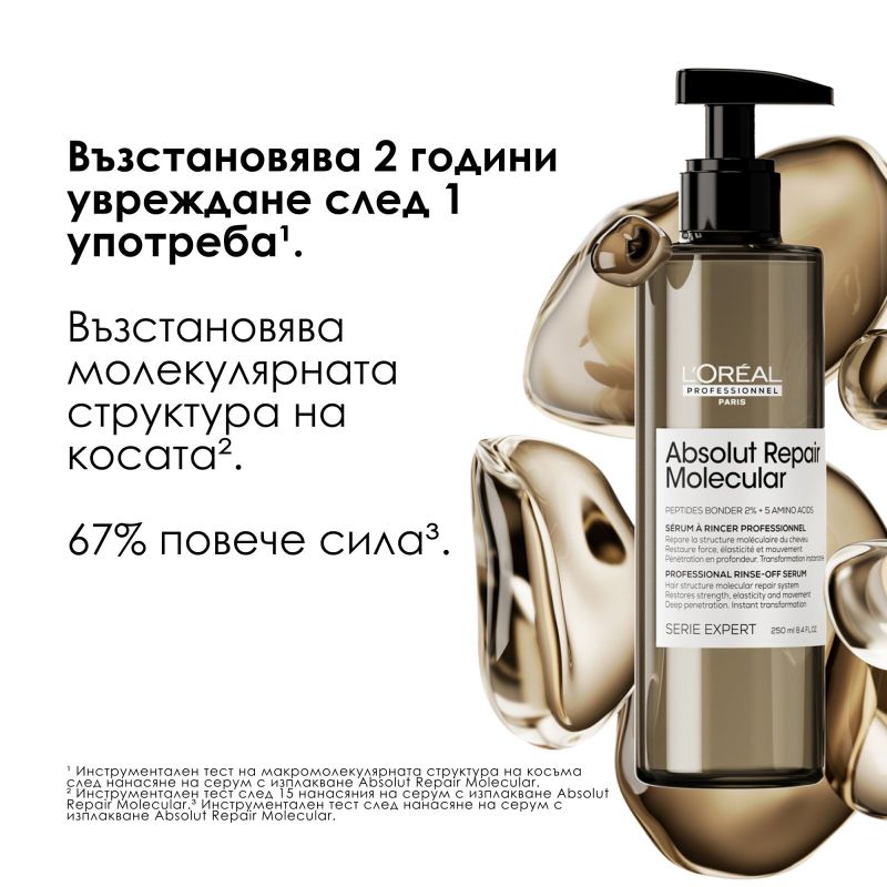 - Серум Absolut Repair Molecular с изплакване за увредена коса, който действа като маска, обогатен с 2% система за защита на пептидните връзки и 5 аминокиселини. Осигурява възстановяване на молекулярната структура на косата чрез възстановяване на слабите връзки в косъма*, а това означава повече от повърхностно възстановяване – укрепва вътрешността на косъма на молекулярно ниво.