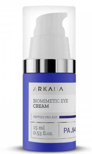 Arkana Biomimetic Eye Anti Wrinkle Eye Cream съдържа 5% активни вещества като ProgelineTM, хиалуронова киселина и кофеин. ProgelineTM е технологично революционен трипептид, който активно инхибира синтеза на прогерин (протеинът, отговорен за стареенето на кожата). Хиалуроновата киселина осигурява дълбока хидратация, действайки активно на всички нива на кожата. Кофеинът подобрява микроциркулацията, като намалява подуването и премахва появата на умора. Нещо повече, добавянето на гроздово масло и витамин Е предотвратява вредното въздействие на свободните радикали (които причиняват по-бързо стареене на кожата).