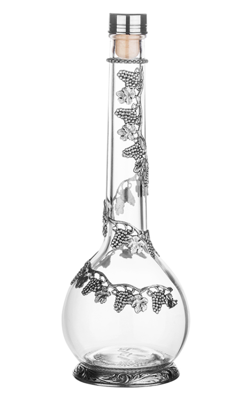Съдът е с оригинална визия- форма на колба и декорация от спирала от лоза, изработена от сплав от калай и сребро.