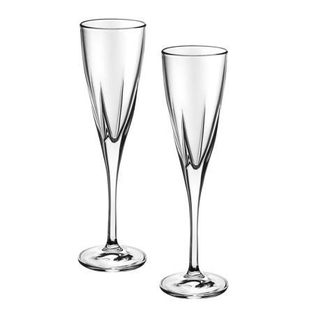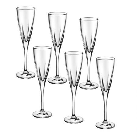 Чаши: Ø 6,8 см. Височина: 23,5 см. Вместимост: 170 мл. Стилен сервиз от 6 чаши за шампанско, произведени от италианската фирма RCR Crystal. Чашите създават усещане за наслада от вкуса на шампанското, с изящен дизайн и нестандартна форма. Подходящи за почистване в съдомиялна машина. Подарете си финес и красота на масата с италианско качество.